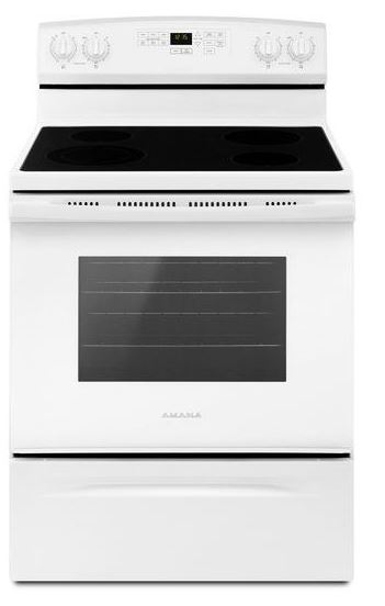 A bright and modern addition to your kitchen, the Amana Self-Cleaning Smoothtop Electric Range - White (30") [Model AER6603SFW] is designed for both style and function. The sleek white finish complements a wide range of kitchen designs, while the smooth glass-ceramic cooktop provides a contemporary look and easy-to-clean surface. With its spacious oven and self-cleaning technology, this range simplifies meal preparation and cleanup, making it a reliable partner for busy households.