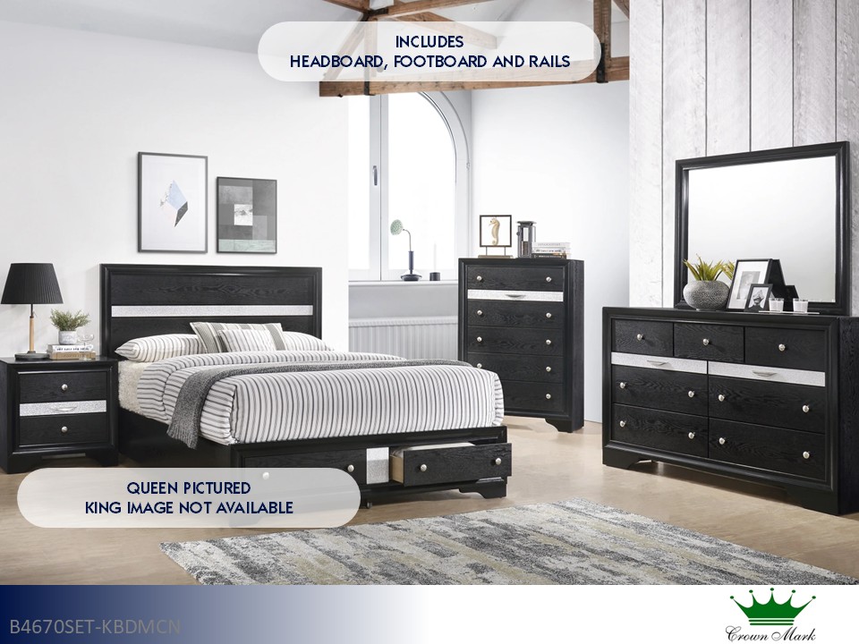 Crown Mark Regata Black Bedroom Set (King Bed with Dresser, Mirror, Chest, Nightstand)