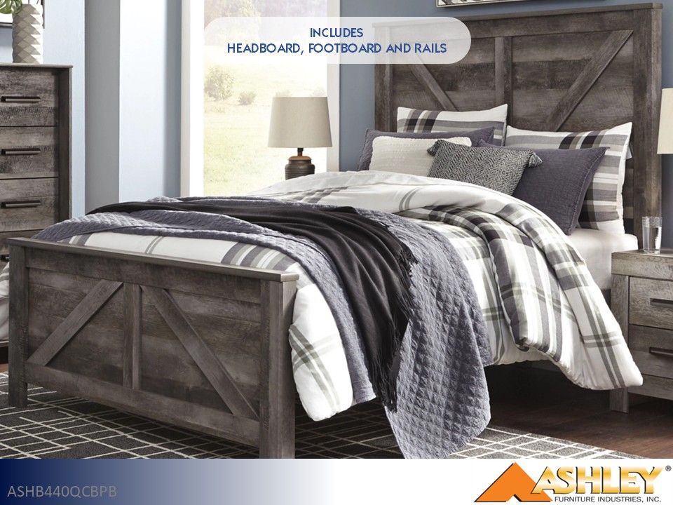 Rustic farmhouse charm meets contemporary design with the Ashley Wynnlow Bed - Gray (Queen Crossbuck Poster). Featuring a crossbuck design on the posters and a rustic gray finish, this bed is crafted to bring natural texture and modern appeal into your bedroom. Its sturdy frame and sleek lines make it a striking centerpiece that blends effortlessly with various décor styles.